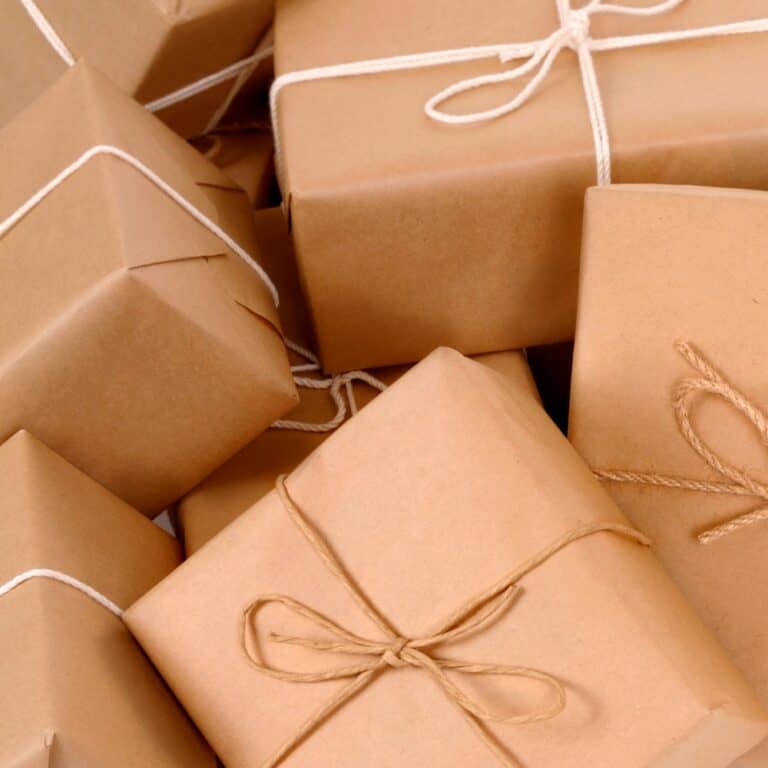 • A pile of boxes wrapped in brown paper and string, with the words "how to download your entire Amazon Order History."