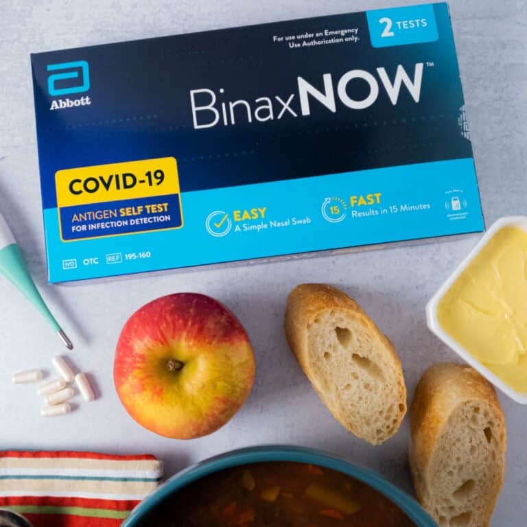 • A BinaxNow COVID test box, a thermometer, some pills, and various food items on a counter.